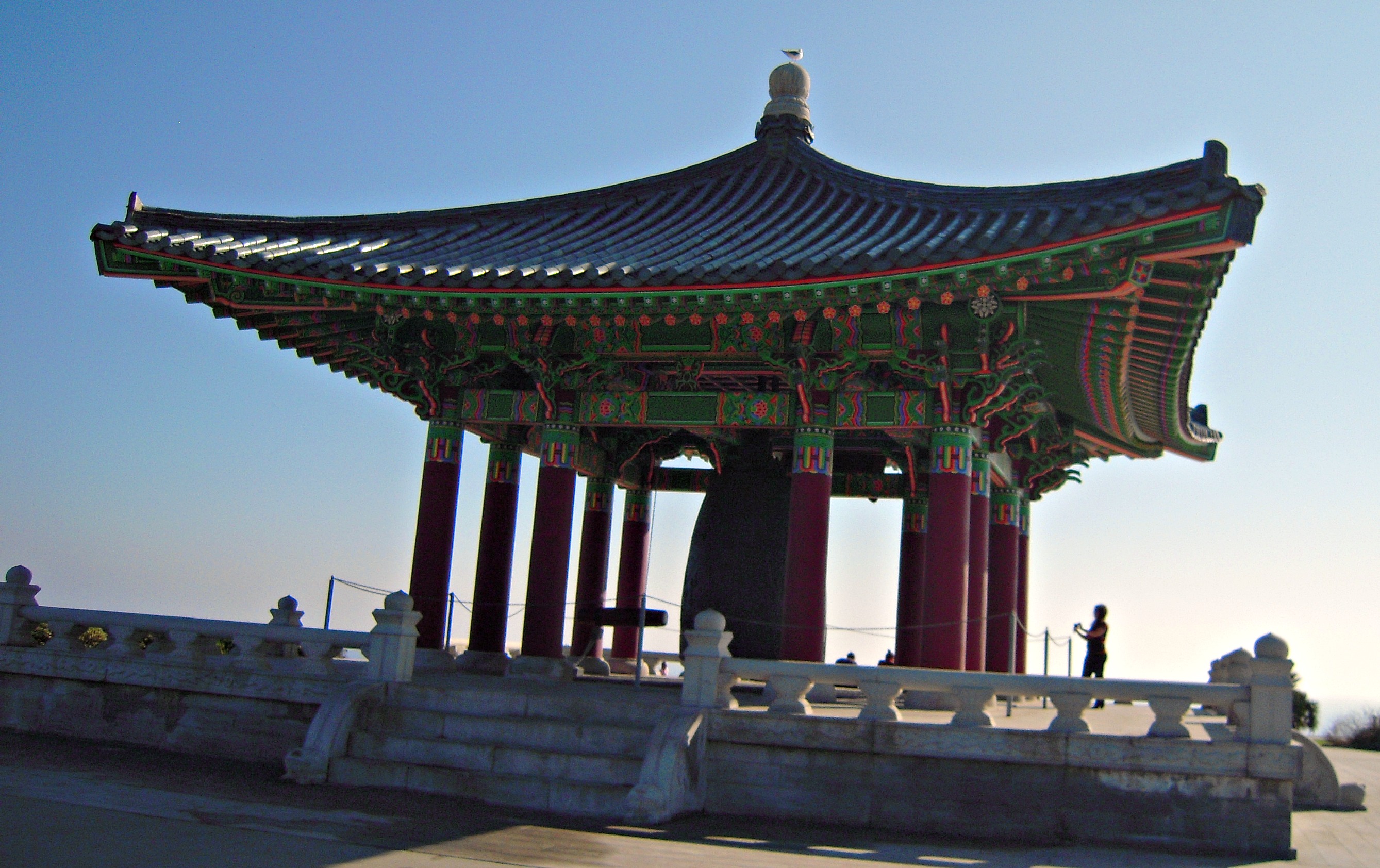High atop the hills in San Pedro along the Pacific Ocean sits the Korean Bell of Friendship. Standing 12 feet high and made of over 17 tons of copper and tin with gold, nickel, lead and phosphorus added to it for brilliancy, this gift from the Republic of Korea back in 1976 is an impressive sight. The bell has recently had a “touch up” so the colors are incredibly vibrant making the intricate details of the woodwork “pop” spectacularly.