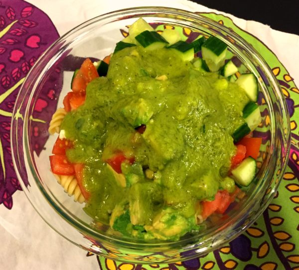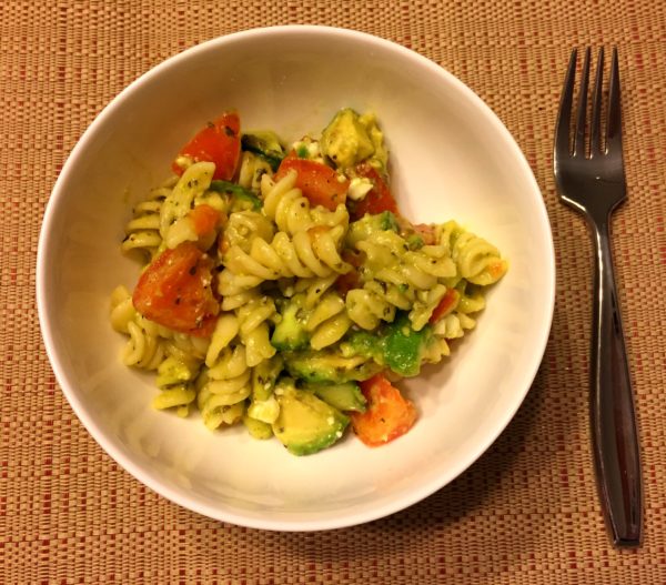 This recipe is an extremely easy, healthy, and quick pasta salad for those nights you don’t have time to fuss about with dinner. The warmth of the pasta makes me feel like I am eating an evening meal (not sure why heat correlates with an evening meal for me, but that self-analysis will have to wait) and the cucumber, tomato, and avocado add healthy nutrients. Here is what you’ll need: